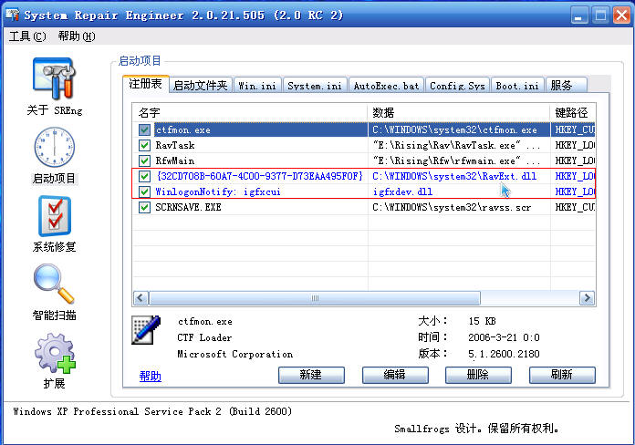 SREng提示我两个蓝色未知状态项目,帮我看看删除它们可以吗?还有我的鼠标指的那个好像是瑞星的一个什么链接库文件吧?也有可能是病毒,我不敢确信所以请各位帮帮忙,谢啦……