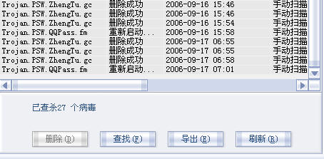总共是四个木马,看名字三个好象是盗<征途>帐号的,一个是盗QQ的,可就是杀不掉.我都是用瑞星在安全模式下杀的,大家可以看下杀毒日志,昨天下午我杀了一次,说是删除成功,可今天早上又杀,居然还在有.