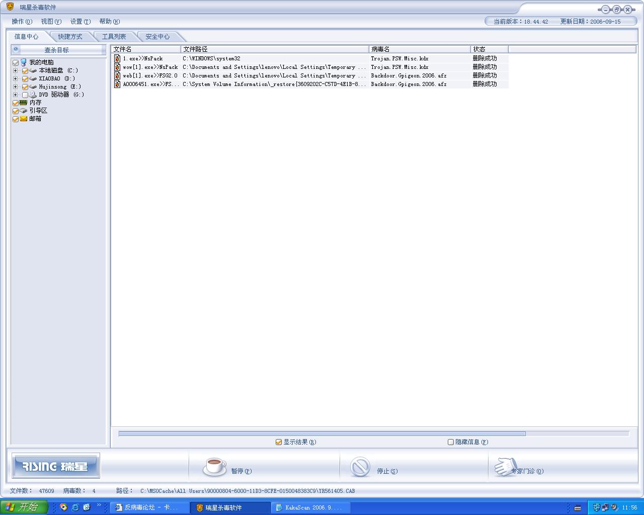 瑞星可以升级,杀毒的话,两个病毒始终杀不掉