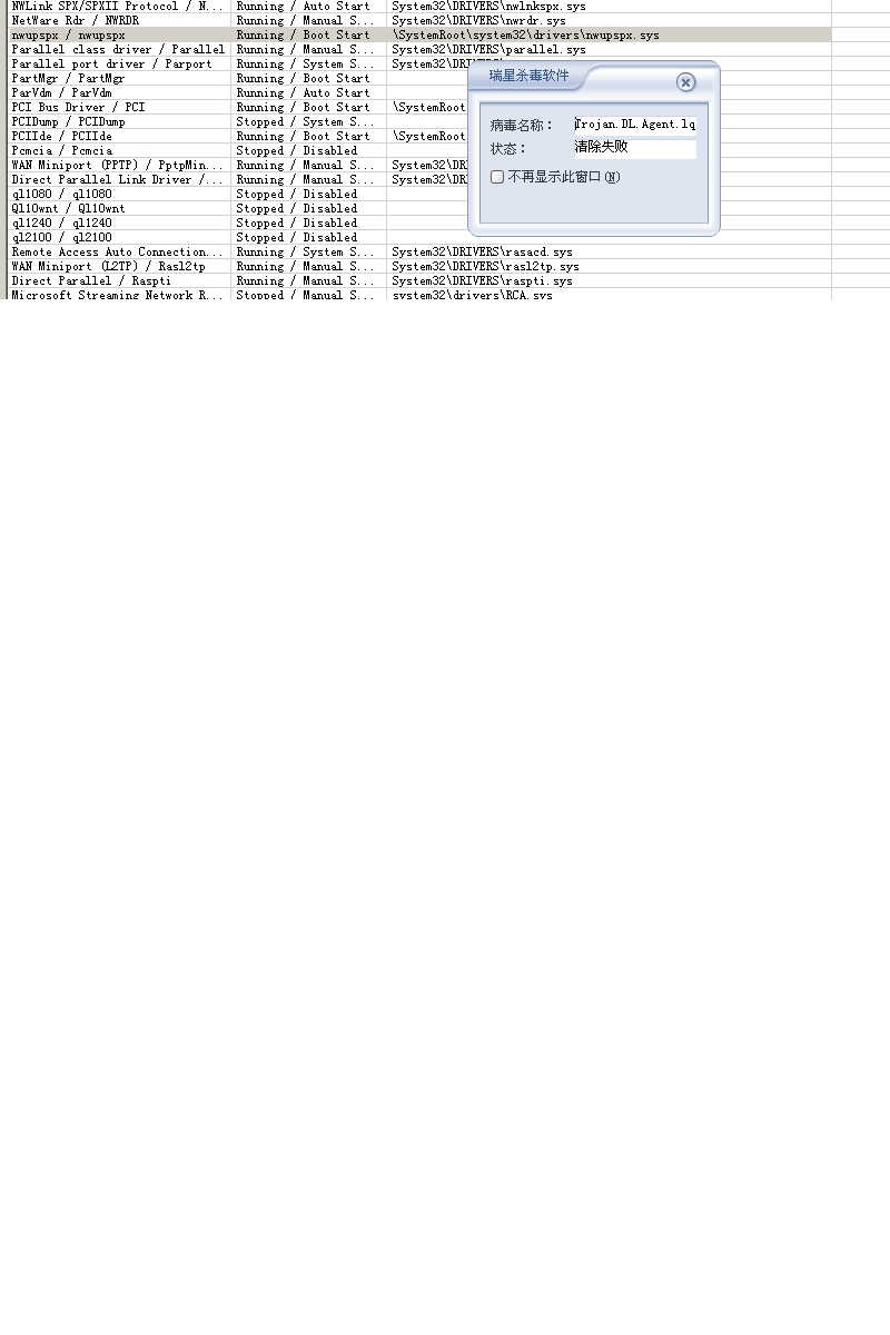 【与时拒进的贴子】我一直没杀这个毒,因为冰刃1.18一安装,我的机子就重启。所以问题一直存在,开机后,杀毒,在%\System32\drivers下杀不掉nwupspx.sys(不知瑞星为什么杀不掉)。打开IE,瑞星监控报告拦截到Trojan.DL.Small.oan病毒的提示。我用SREng2扫描日志,发现SREng2的驱动服务项里面仍然有nwupspx存在,状态running,点击,居然不让动,出来nwupspx.sys,附图,删除失败。请问这病毒是什么病毒?攻击原理是什么?在没有冰刃的情况下怎么杀?