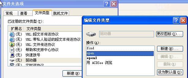 在网上找到了一些方法,比如修改驱别器,编辑文件类型,可是却发现里面的find 和 open项已经被禁用,这怎么修改呀,(如图)所以只好新建了open1 ,这样就可以在盘符上点右键,选新建的open1来找开盘符,