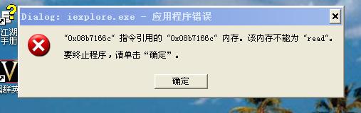 每次打开IE..然后关闭..都会弹出一个"0x027b166c"指令引用"0x027b166c"内存,该内存不能为"read"要终止程序.单击”确定”...各位大虾这是什么问题啊..请各位帮我解决!!!!!!!谢谢