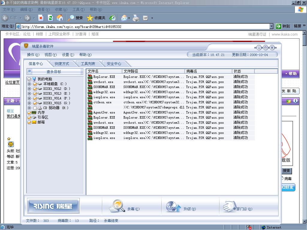 瑞星卡卡安全论坛技术交流区反病毒/反流氓软件论坛 杀不掉的病毒求助啊 最新瑞星版本18.47.21!!QQpass