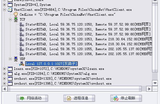 这是我刚发现的,不知是什么意思,是中了灰鸽子吗?如果我用XP连接就出现在svchost.exe里面,我用星空连接就会出现在图中这里,请高手指点一下啊,谢谢。。。。