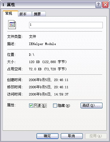 我的XP系统装在了D盘中,也许这个名为“1”的恶性文件就留在了我电脑中两个位置:一是D:\Documents and Settings\All Users\Application Data\Microsoft\IEHelper\IEHelper_5048.dll 文件;二是我的D盘根下,这个文件名就为“1”,它没有扩展名,我把它故意加上扩展名为“doc,mpg,rm,dat,avi”等一系列的扩展名都试过,结果丝毫没有影响这个文件的“拒绝访问”的属性,在DOS下与在Windows都拿它没有办法。请教网站高手帮一下。