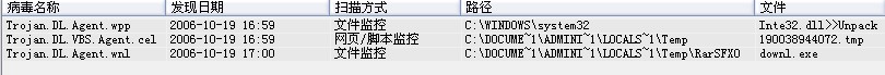 Trojan.DL.Agent.wpp  Trojan.DL.Agent.wnl  和Trojan.DL.VBS.Agent.cel .我就是大致猜测我机器是不是被加载什么插件,那个插件本身无毒,却每次在我打开IE的时候让我跳到那个网站.可是重新装了2次还是出现类似情况,不知道怎么才能解决.难道已经在别的盘了?希望瑞星帮助!