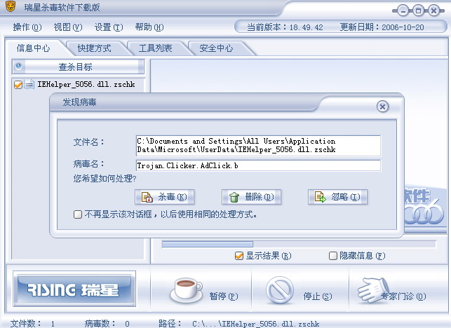 瑞星卡卡安全论坛技术交流区反病毒/反流氓软件论坛 重启后还是无法清除病毒Trojan.Clicker.AdClick.b