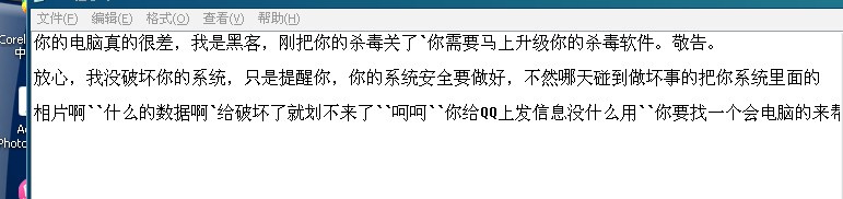 上网自动弹开一个文本(有的通过QQ发送过来),大致都是:你的电脑真差,我是黑客,把你的杀毒关了,什么你的安全性很低,我不会删你的文件,不过不排除他人,你给QQ发信息也没有什么用,最好找一个会电脑的帮你。。。。