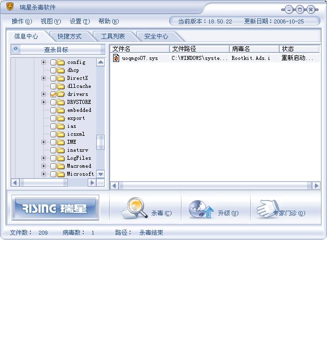 以前瑞新查不出这个病毒。。但就这几天跟新了杀毒软件。。就认为这是病毒。。但是杀不掉。。提示重启电脑。。但是重启了还是提示重启电脑。。我在安全模式下也无法删除。。求救