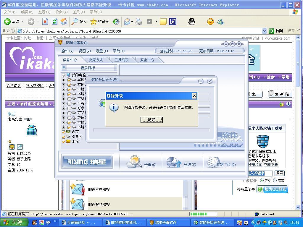 更绝的你还没见过。隐藏文件不让显示,瑞星监控自动退出,手动打开后发现监控项全关。瑞星不让打开,不让装,不让删,不让升级,所有瑞星工具打不开。天网防火墙自动退出,也打不开。到瑞星网站在线查毒,刚查出几个病毒就自动重启。安全模式下打开瑞星杀毒,结果里面没有盘让你杀。启动项全关,开机又有。倒了。