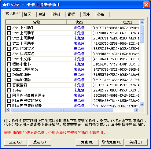 个人觉得,插件免疫绝对是以前的界面好,分门别类,比如我可以直接选择"国外"这个页,然后"全选"--"免疫",还可以使用反选功能,加快选择.