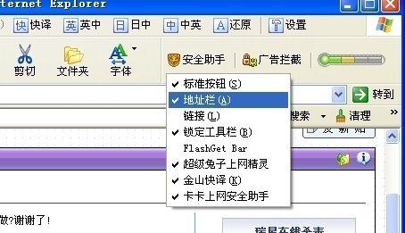 在“标准按钮”栏处点右键,在“卡卡上网安全助手”打上钩就可以了。