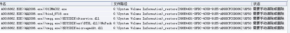 由于系统总是在开机时要重启一次,又老是查到病毒,所以我就把C盘格了,然后重装了系统,但是没想到瑞星竟然在G盘查到病毒,而且需要手动删除,可它看起来又像是注册表,我根本找不到那个病毒文件.