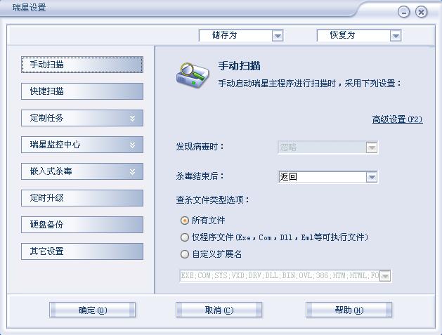瑞星的详细设置中不管是手动扫描还是快速扫描的“发现病毒时”后面的选项被锁定为“忽略”,不可更改,卸载后重装时的设置也是如此,怎么办?如图所示