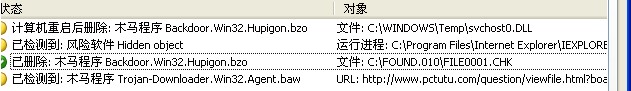 卡巴每次开机都能检测到Backdoor.Win32.Hupigon.boz,说重启可杀,但重启后病毒还在,无法彻底删除.请高手指点彻底删除之计,附上扫描日志供参考,另外,附件中是卡巴检测结果的截图,本人QQ:393896809,在线但隐身,因工作需要.若能QQ指点迷津,将感恩不尽.谢谢!