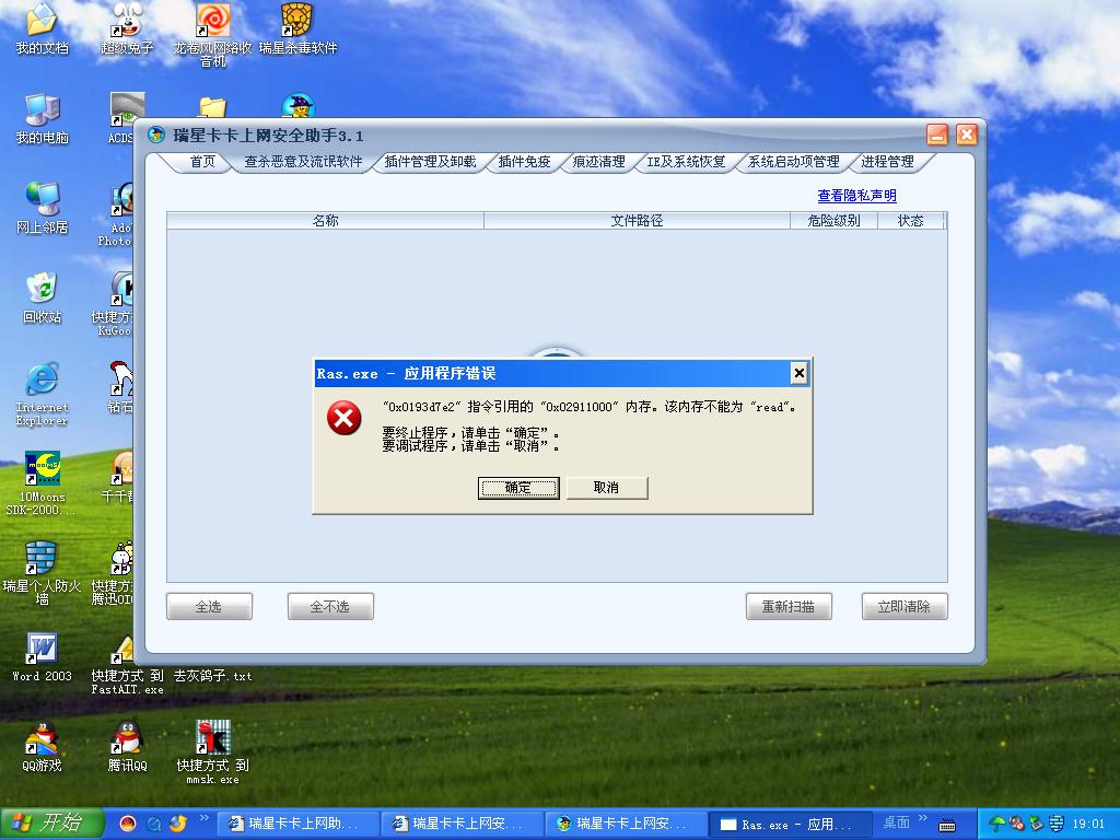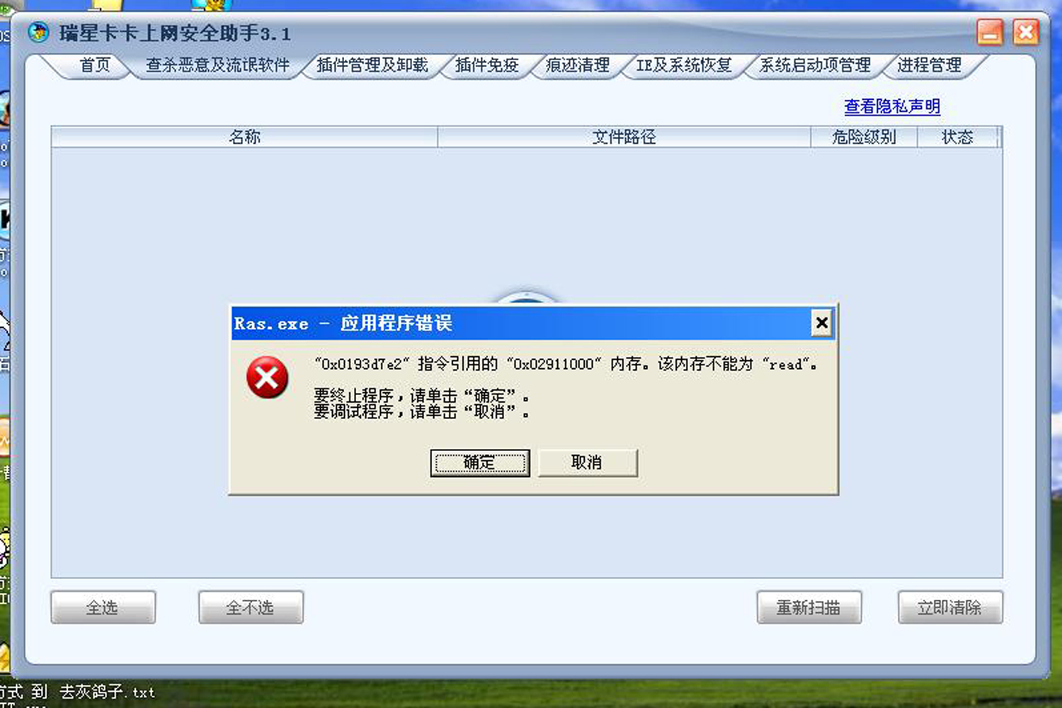 我的,安全助手3.0,为什么不能使用"查杀恶意及流氓软件'这个功能,一用就显示这个[图]后"按确定'或"取消'都自动退出.请高手指定,我在线等.