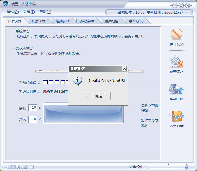 我的是2005正版瑞星..杀毒软件早就升级到2007了..但是防火墙一直没有动静!总是有这个提示..而且界面显示有点大..中间的2个选项丢了一半..图片里很清楚..谁知道怎么回事啊?