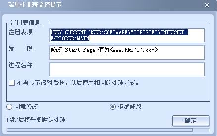 我的"瑞星注册表表监控提示"老是显示"修改<Start Page>值为<www.hk0707.com>"和"修改<Start Page>值为<www.hk0909.com>"...我已经勾选了"不再显示该对话框,以后按相同的方式方式处理"还是不断弹出该对话框...请高手帮忙解决...先谢了...