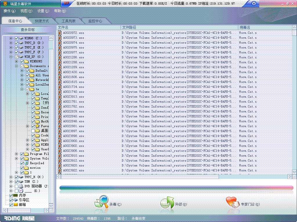【求助】瑞星升级到2007后。发现大量的Worm.Cnt.s病毒。