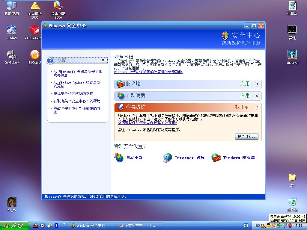 今天早起开机就出现安全警报,提示未装杀毒软件。可小绿伞在下面好好的,昨天还没事呢。