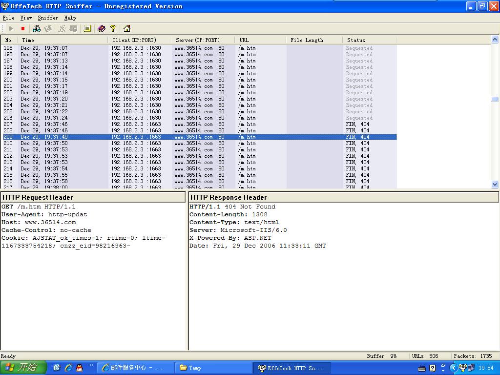 从瑞星防火墙的连接信息中可以看到,IE一直在与IP地址为 61.152.93.66 的机器进行http通信,然后采用 EffeTech HTTP Sniffer 工具截取发送和接收的数据包,发现IE7一直在从