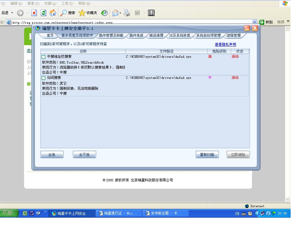 我的版本是3.1.0.15 我用卡卡清理半天了,就是弄不下去它~它们分别是:中搜地址栏搜索c:\windows\system32\drivers\Anfad.sys 和划词搜索c:\windows\system32\drivers\Anfad.sys都是这个文件路径~ 表现行为:经常莫名奇妙的死机..请楼老大帮忙。谢谢~