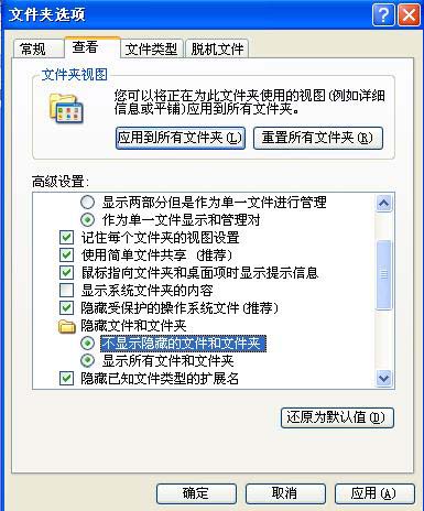 最近我的电脑不可以显示隐藏文件了,打开文件夹选项,就成了图片的样子。选中后,在打开,还是这样了了。我用了网上说的,新建记事本写入相关数据后,导入注册表,当时有效,可重启机后,还是这样!这是什么病毒呀,请大家帮我解决。我用的是XP