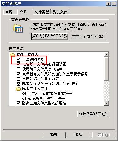 Windows 2000/XP/2003在默认情况下采用缩略图功能,但通过设置即可禁止在所有的图片文件夹中自动生成“Thumbs.db”文件:在“控制面板”中双击“文件夹选项”,在“文件夹选项”对话框中切换到“查看”标签,在“不缓存缩略图”复选框前打上“√”(如图),再点击“确定”按钮退出即可。