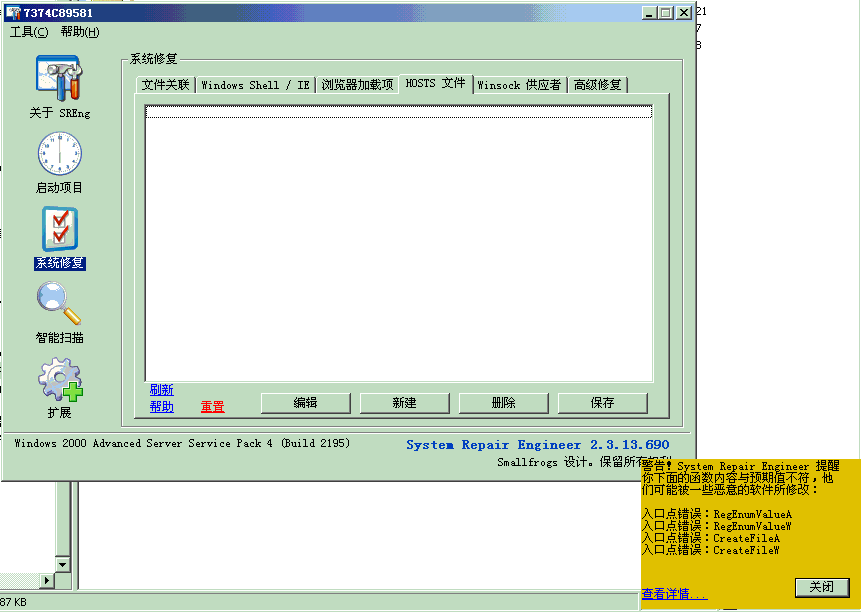 这是扫出的日志,hosts文件不能删除(内容为01项),用windows清理助手发现下述流氓病毒: