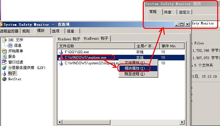 模块-->钩子-->WinEvent钩子-->选择explorer右击-->选择模块属性莫名其妙地腾出System Safety Monitor目录属性。不知道何解。