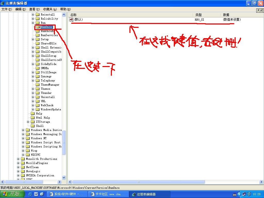 你确认"图中1处的项,项下没有包含zqlt_k.dll的字段"?用鼠标左键点一下那个“.....\runonce”注册表项,右边列表中应该显示包含zqlt_k.dll的字段。只要把那个键值删除就行了。