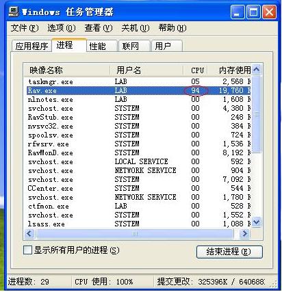 电脑开始运行好好的,突然觉得系统变慢了,打开系统进程,才发现是瑞星惹的祸,CPU占用率居高不下,都无法结束其进程,难道瑞星也........?求助怎样才能解决此种现象啊,