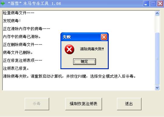 我用“落雪”木马专杀工具 1.06 Made By 幸福的狮子(C.I.S.R.T.)和smss专杀工具都无法清除.见图