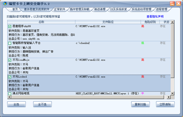 我的一个机子中了sky99,loadMejx,looked 是用卡卡查出来的。用了无数办法来杀,重启后卡卡还是显示有这三个病毒,我用过的工具有:瑞星、卡卡、超经兔子、落雪专杀工具、“威金”蠕虫专杀工具、安全卫士等等....