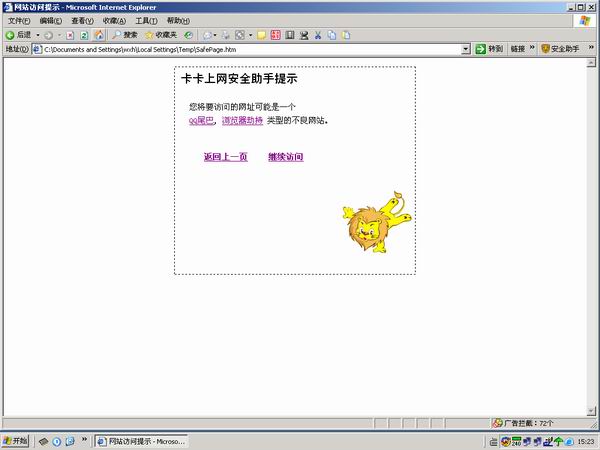 为了上网方便,主页设置http://www.haol23.com/,以前都很正常,最近为了安全,减少干扰,装上了瑞星卡卡,可是问题来了:每次登录后首先显示的却是瑞星卡卡的安全提示,需要继续后才能登录hao123网站,非常烦人,[img][/img]