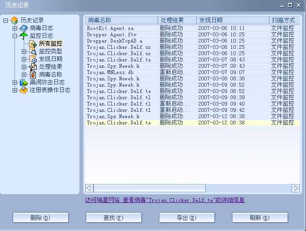 每次开机后瑞星监控都查到Trojan.Spy.Neweb.k Trojan.Clicker.Delf.te两个木马病毒,处理结果显示删除成功,但重新开机后,又会出现,请各位高手帮帮忙,怎么样彻底删除,谢谢~!