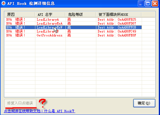 RVA  错误: GetProcAddress (危险等级: 高,  被下面模块所HOOK: Dest Addr: 0xF108AE8F)