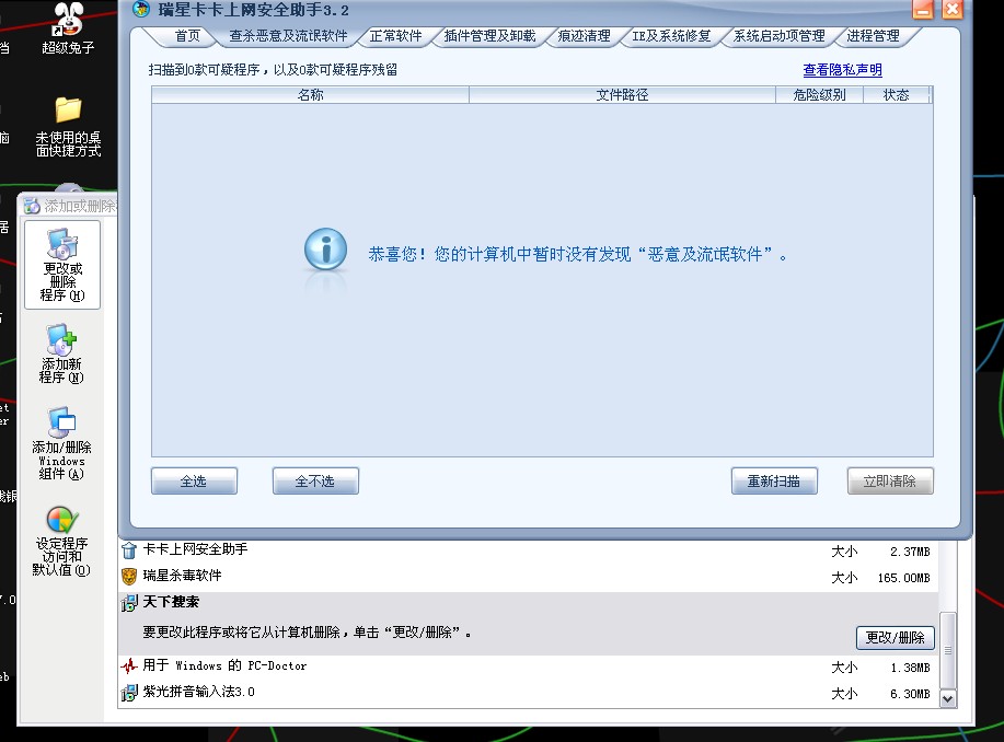 用超级兔子的最新版,专业卸载中,也检测不到;用标准卸载,可以找到,但卸载不掉!