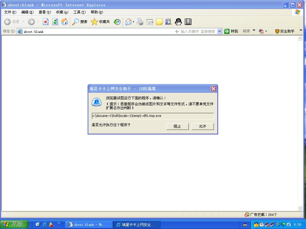 我已清除过IE的临时文件和COOK,都不行!,每次第一IE启动都有不明文件运行,如附图,每次的文件名都不同的,均被我选择阻止,然后打开多次IE,都不回出现的,是病毒或其他?请教并能清除!!