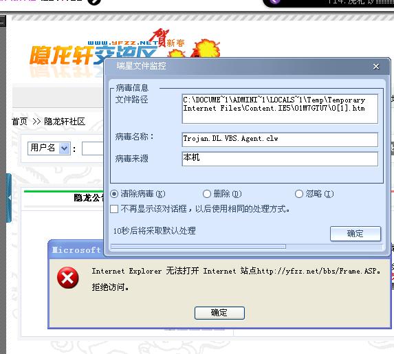 最近有朋友反映登陆我的网站:http://www.yfzz.net/时经常被瑞星提示发现Trojan.DL.VBS.Agent.clo病毒,且不是一次两次了,同时另一瑞星用户也如此跟我反映,从相关文件中并没有查到什么病毒信息,在登陆后查看浏览器生成的源文件也未发现异样。这到底是怎么一回事?是瑞星过于敏感?又或是其他原因?