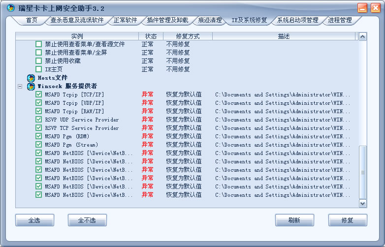 【求助】卡卡助手显示“Winsock服务提供者”下的各项异常,却不能修复!