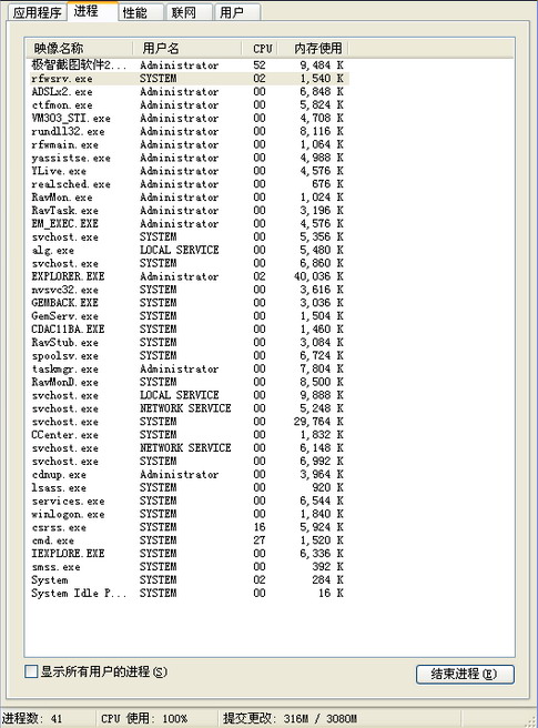 我电脑一启动就有45个进程,现在又中了病毒CPU占用率100%,用瑞星杀毒都不走"表"(查杀文件数量),现在小弟新病\老病一起求大家解决,麻烦大家了!~~~~~~