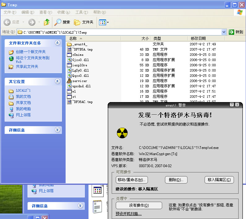各位大侠,我的电脑启动就会出现以下文件,还被测验到是病毒文件,删也删不掉.隔离也不行.急死我了.大家帮我看看.给个解决方法,小弟不胜感激....