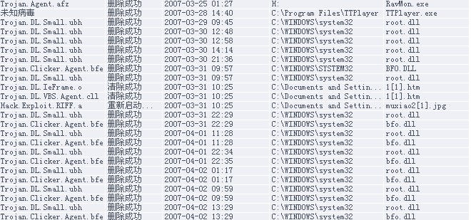 而且最气人的是两个病毒在百度上根本找不到!1!Trojan.DL.Small.ubh(root.dll)这个在瑞星病毒资料库也找不到任何信息,而Trojan.Clicker.Agent.bfe(bfo.dll)在几天前已经有信息,但百度还是找不到~~~!