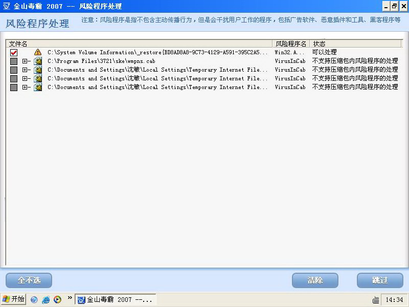 一、尽管我个人更偏爱瑞星,家里电脑装的也是瑞星,但是公司统一装的是金山毒霸。现在用最新升级的金山查杀公司电脑后显示结果如附图,其中有四条“不支持压缩包内风险程序的处理”。