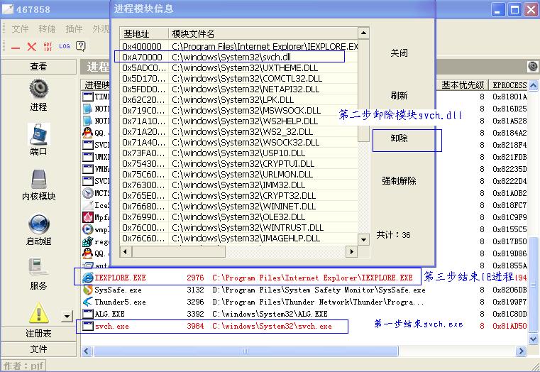 2.运行icesword卸除病毒模块<如图一>