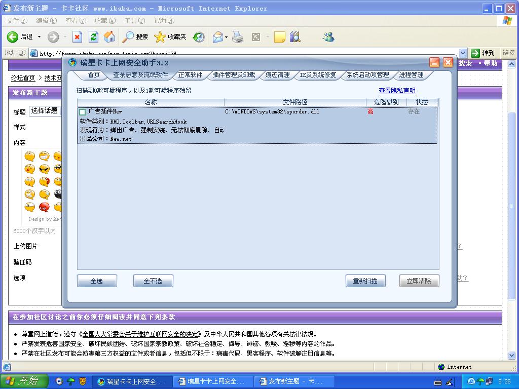 每次清除流氓软件后的下次开机就会提示"sporder.dll"文件找不到,找1个来复制进去后就没问题了,但再次运行卡卡,就会出现有流氓软件"广告插件New"