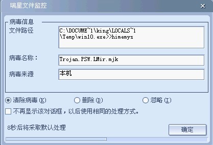 我是用下载瑞星杀毒软件查杀的,在查杀过程中查到显示,来自本机病毒,如图:
