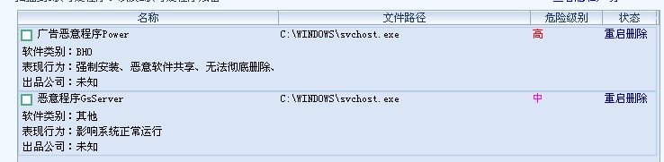 我用瑞星卡卡杀恶意程序,可瑞星卡卡提示说部分程序需重启才可删除,可重启后还是没用,我用系统备份重装了系统都没用,这个恶意程序名字是GsServer和Power两个恶意程序,有的时候还有好几个类似的恶意程序,我该怎么办呢?那位高手能详细的指点一下吗?小弟在此谢过了!!!