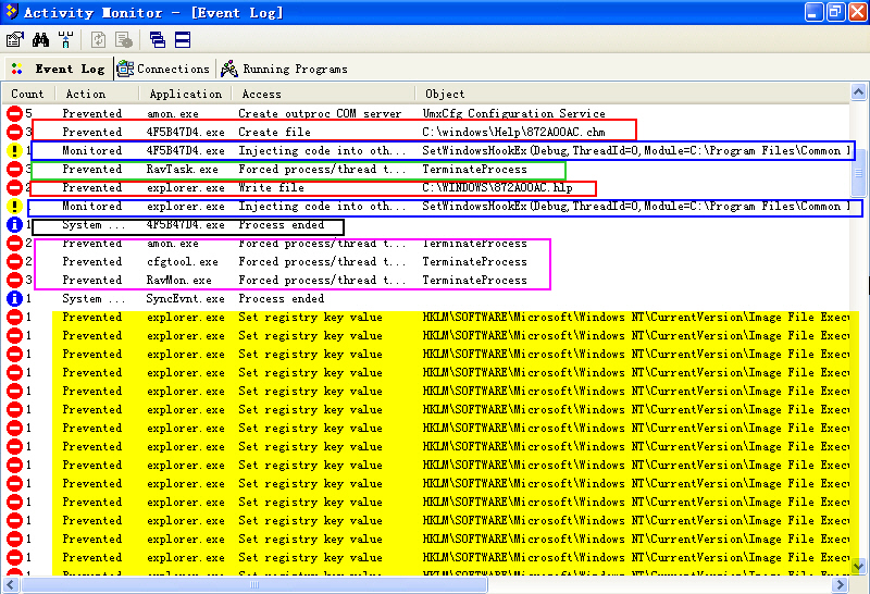 图1:病毒的一个文件释放被阻止(红框;因为WINDOWS文件夹的防护未取消);病毒模块插入了应用程序进程(蓝框);病毒试图终止瑞星进程的动作被阻止(绿框;TINY的“禁止强迫进程终止”规则生效);病毒.exe程序自身结束运行(黑框);病毒模块试图关闭应用程序进程被阻止(粉框)。